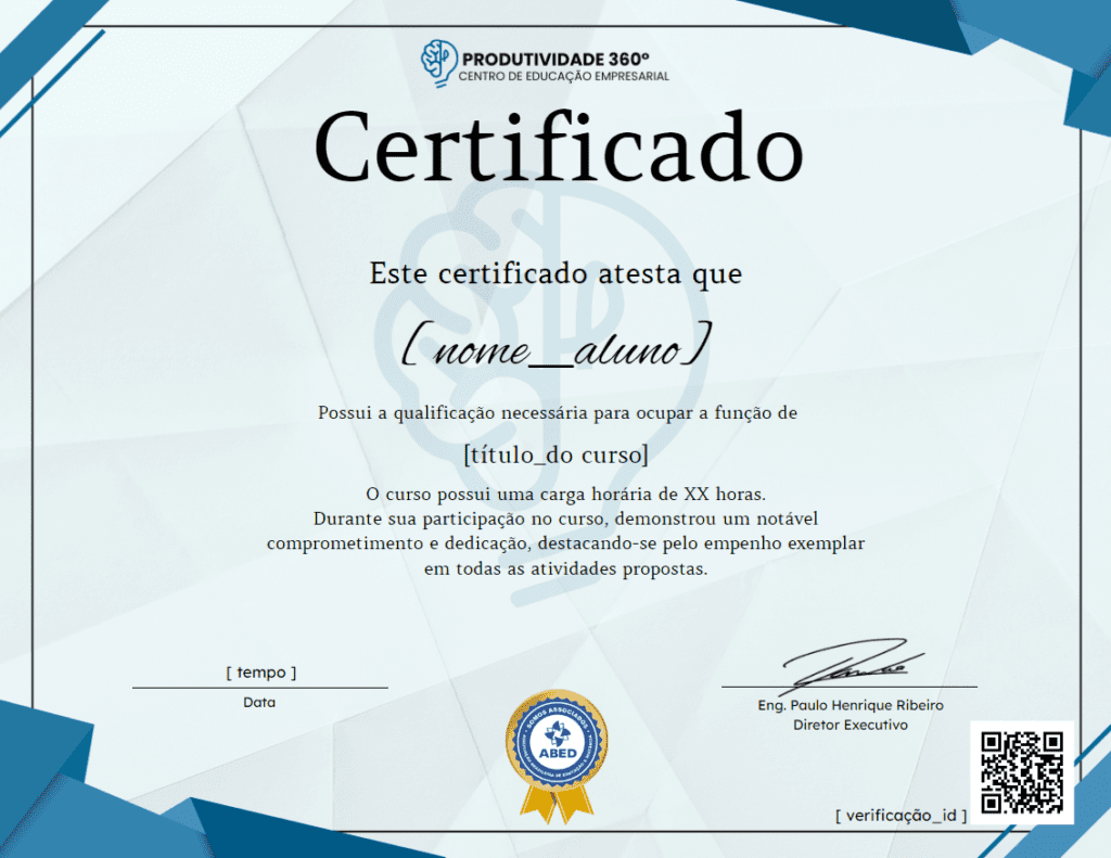 A Produtividade360 se compromete a fornecer formação de alta qualidade, alinhada às melhores práticas educacionais e ao desenvolvimento contínuo dos nossos alunos. No entanto, a aceitação dos certificados emitidos por nossos cursos é de responsabilidade das instituições ou empresas destinatárias, e não podemos garantir sua aceitação em todas as circunstâncias.